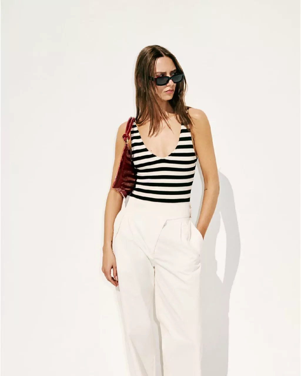 Body De Jersey Rayado Pesado. Calce Fit Al Cuerpo Con Escote V Profundo En Delantero Y En Espalda. Acceso Por Entrepierna Con Broches